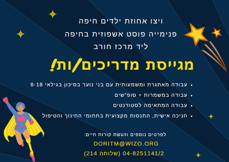 אנחנו מחפשים מדריכים/ות, עם לב רחב, עם רצון להעניק ולתת משמעות וסיכוי לילדים רכים, הזקוקים לנו, לאחות ולרפא את הפצעים והחוויות הקשות שעברו בחייהם הקצרים.