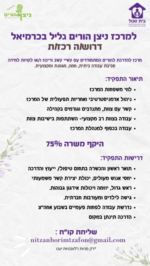למערכת הגיל הרך בישוב צורית (בין עכו לכרמיאל) דרוש/ה מנהל/ת חינוך לגיל הרך