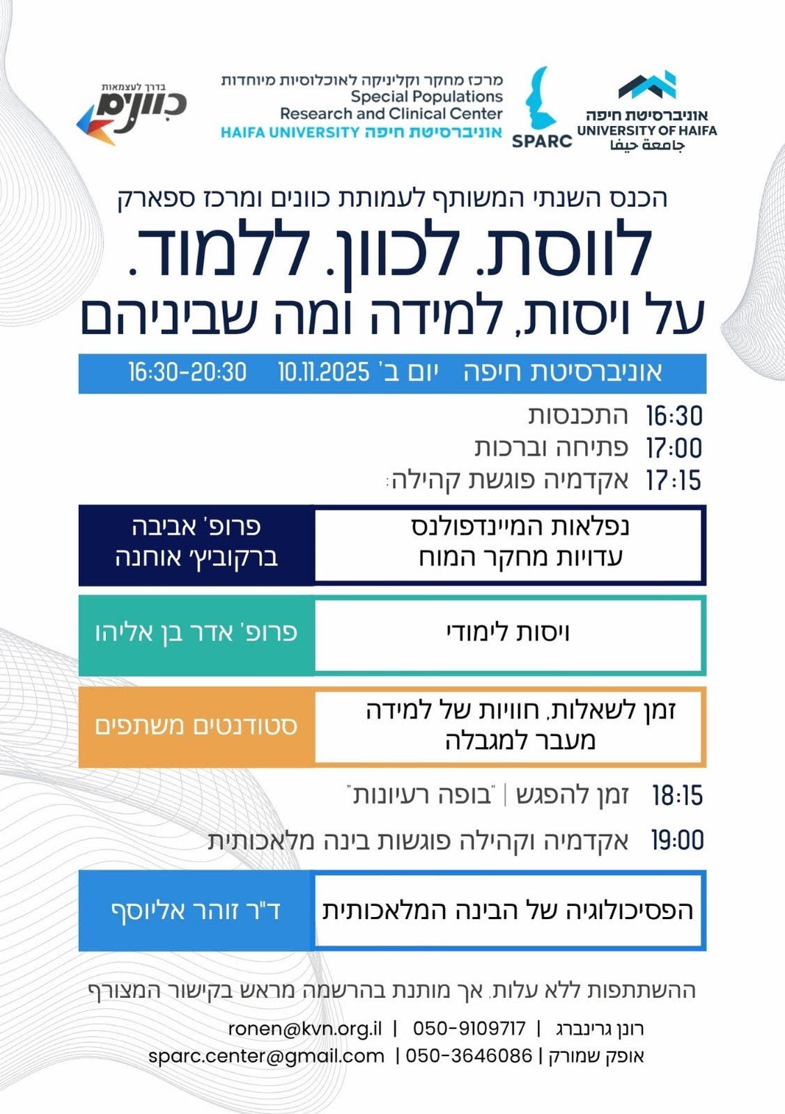 מרכז ספארק- מרכז שמשלב בין אקדמיה לקהילה האוטיסטית, החוג לשונות התפתחותית ועמותת כוונים שמחים להזמין אתכם לכנס השנתי שלנו. השנה, בנושא ״לווסת, לכוון, ללמוד״.- על ויסות, למידה ומה שבינהם.