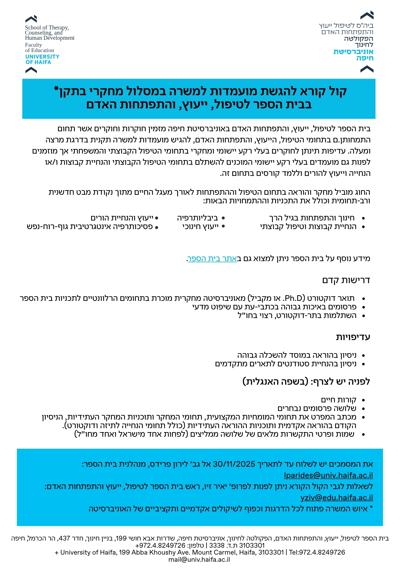 קול קורא למשרה בבית הספר לטיפול ייעוץ והתפתחות האדם