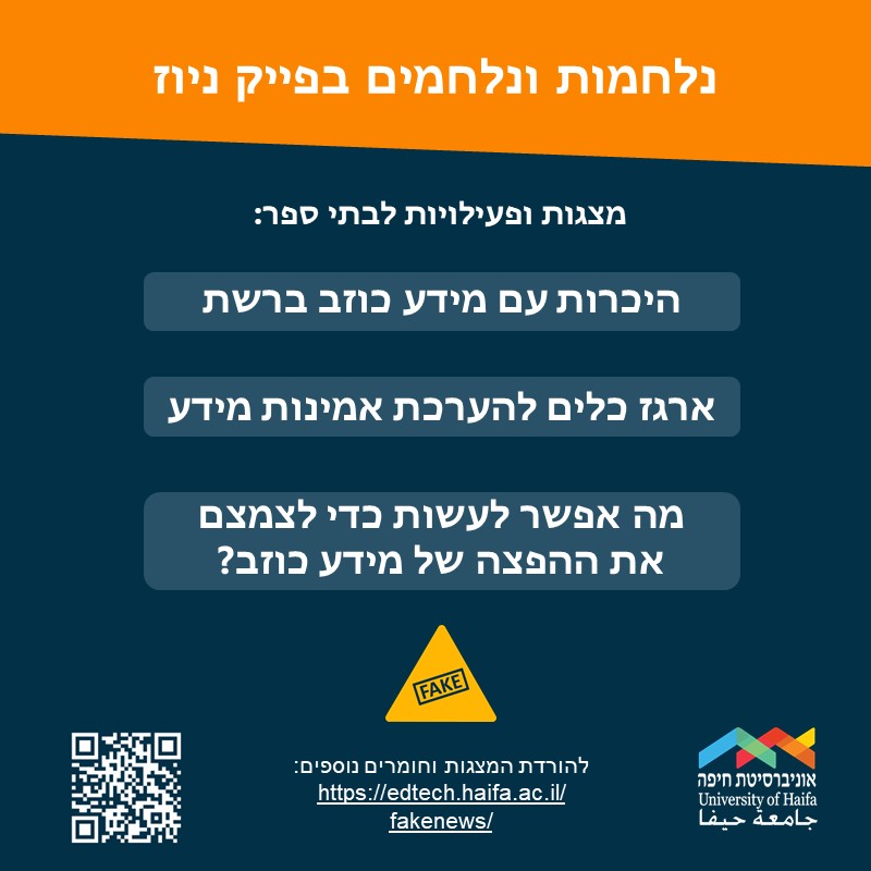 מורות ומורים יקרים, מצורפות כאן לשימושכם מצגות ופעילויות על תופעת המידע הכוזב ועל דרכי התמודדות עימה, שפותחו במיוחד עבור המצב המורכב הנוכחי.