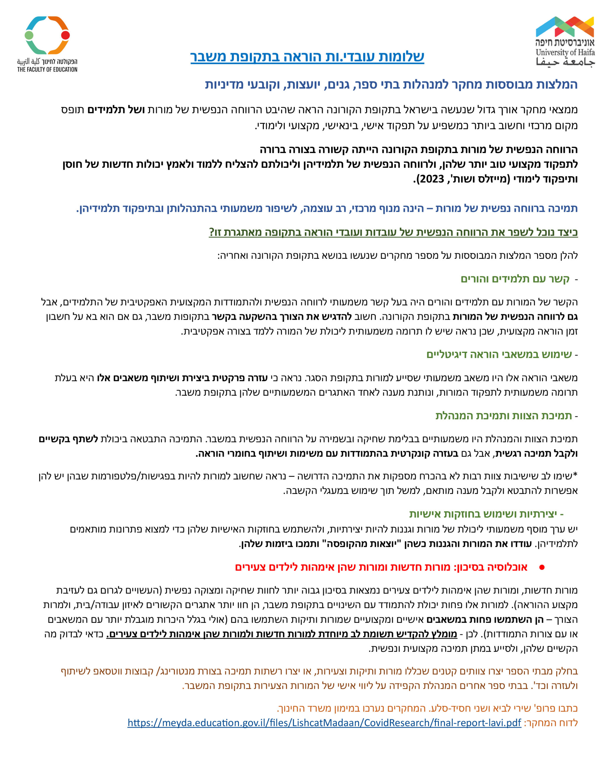 תמיכה בשלומות של צוותי החינוך בעיתות חירום ומשבר