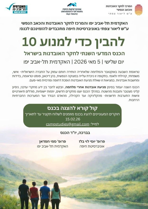 פשוט מגיעים. הכנס השנתי לחקר האובדנות בישראל – להבין בכדי למנוע 10 (!!) חוזר! כבר כמה שנים שאנחנו יוצרים קהילה בישראל ותמיד כולם מוזמנים! והכנסים תמיד מעניינים, ותמיד ללא תשלום (כי ככה זה בקהילה), ותמיד עם חיבוקים ורצון לעשות טוב.