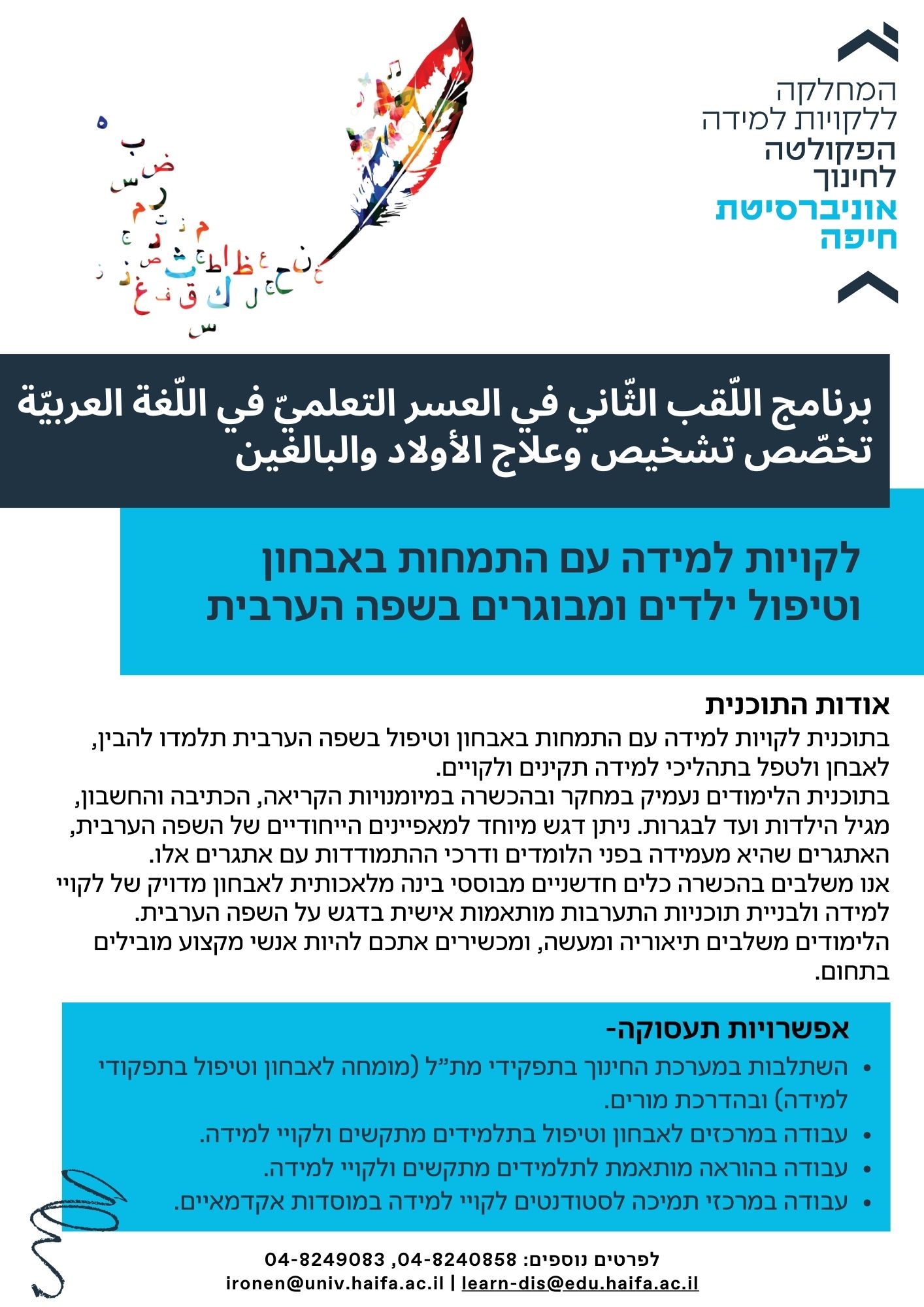 *תוכנית לימודים אקדמית וקלינית ייעודית בנושא לקויות למידה בשפה הערבית. התוכנית מונחית עפ״י גישה אבחונית מקיפה ורב תחומית. מטרת התוכנית להכשיר מומחים לחקר, אבחון, טיפול פרטני ועבודה מערכתית בתחום לקויות הלמידה בשפה הערבית, שפת האם של המאובחנים ו/או המטופלים.
